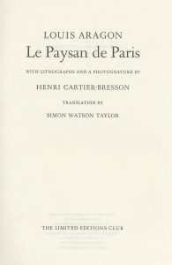 Cartier-Bresson, Henri (1908-2004)/Aragon, Louis (1897-1982) Le paysan de Paris. Limited Editions Club, New York, 1994. In-folio (41 x 31 cm). Édition originale, dédicacée et signée " à Jean (paysan de Gagnac) mon grand instigateur avec ma...