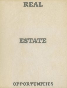 Ruscha, Edward (né en 1937) Real Estate Opportunities. Edward Ruscha, 1970. In-12 (18 x 14 cm). Édition originale, brochée, limitée à 4 000 ex. Couverture souple titrée sous jaquette transparente en papier cristal. Ref. Hasselblad, pp. 198-99.