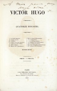 Hugo (Victor). Quatorze discours. Huitième édition. Paris, La Librairie nouvelle, 1851. In-8, broché, chemise bradel demi-chagrin bordeaux avec coins et étui (René Aussourd). Troisième édition collective des discours prononcés par Victor Hugo...