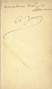 janséniste façon peau de reptile, titre de l'ouvrage en capitales à l'oeser bleu, rouge et vert sur le premier plat, nom de l'auteur et date inscrits de même au dos lisse, gardes de nubuck gris foncé, tête dorée, non rogné, couverture, boïte-étui (F. Rousseau 2003). Édition originale, ornée de 2 dessins d'Alfred Jarry représentant le père Ubu. ENVOI AUTOGRAPHE SIGNÉ DE JARRY AU ROMANCIER NATURALISTE LUCIEN DESCAVES (1861-1949), membre de l’Académie Goncourt.