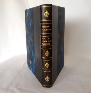 Compositions décoratives, motifs et culs de lampe de Paul Bazé -Bordeaux, Editions Delmas [1944] : In- 12 : 171 p., [1] f.,[ ]1 f.bl. ; 4 ill. en tête de chapitres, culs-de-lampe - demi veau bleu nuit, dos à nerfs orné de filets et de fleurons dorés. Exemplaire N° 12 sur vélin chiffon. Bon exemplaire. Édition originale. Belle impression. Il a été tiré 1000 exemplaires numérotés sur vélin chiffon de Maumont. Une 2e éd. Paraìtra en 1946.
