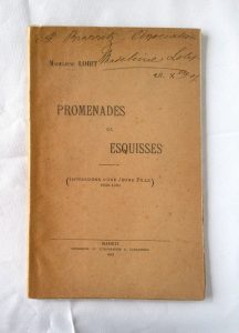 - In-8° : t., [1] f. [Au Lecteur, A ma fille], 83 p. - broché, couv. crème impr. Recherché. Publié par le Dr. Jean Lobit à l'occasion du mariage de sa fille. La majeure partie de l'ouvrage concerne Bayonne et le Pays Basque : Un village basque - Ascain [pp. 1-8], Aux environs de Bayonne [pp. 9-16], Simple esquisse, Terrasse du Rocher de la Vierge [pp. 17-18], Autour de Biarritz [pp. 29-53], Croquis basques [pp. 63-70]. Envoi autographe de l’auteur à Biarritz Association sur la couverture. Non cité par Barbe.