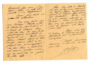 L.A.S., datée du 21 Octobre 1906, adressée à un de ses collègues pyrénéiste. Trois pages pliées au format 12,4 x 26,8 cm, 52 lignes. Importante lettre, très riche en informations sur des sujets importants. Quand à la région découverte par vous, i’en serais ialoux si cela était possible à mon tempérament Avec Castagne, Fontan a fait le Crabioule par le Nord et d’Ussel La Munia idem et que tous deux, au cours de ces performances ont failli se rompre le cou. Tandis que le pauvre Marcel Spont se l’est rompu tout à fait en ne faisant rien, en se reposant. Son frère Henry a produit à cette occasion quelques articles qui ne sont pas du gout le plus sùr Reçu des lettres de Beraldi, son style est toujours amusant. Le Captne Raysse ne peut pas parait-il digérer ma solution du Balaïtous... Mais je persiste à dire que ses mémoires à part, j’ai la logique et les textes pour moi.... Roger [son fils] est en train d’achever les vacances les plus fainéantes qui se puissent imaginer... Saint-Saud a dû lui envoyer des photographies de ses filles que Brulle commente ainsi : Très drole les deux petites grimpeuses scientifiques et l’endroit parait joli. De son cöté, Henri Brulle n’a pas eu le temps de tirer des épreuves de ses photographies, et même d’en développer la plupart.
