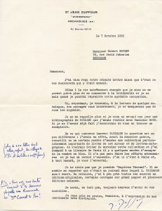 Lettre dactylographiée signée, avec annotations manuscrites de l’auteur, datée du 7 Octobre 1955, sur son papier à en-tête personnel [« Overbrook », Arcangues (B.P.)], adressée au Bibliophile Bordelais Hubert Dupont. Format 21 x 27 cm, 31 lignes dactylographiées et 7 lignes autographes ; avec l’enveloppe d’envoi timbrée. Jean Duffour regrette de ne plus avoir assez de temps pour se consacrer à la bibliophilie. Il propose à H. Dupont de lui envoyer un exemplaire de sa Bibliographie d’Henri Beraldi. Il parle longuement du bagnérais Laurent Tailhade dont il possède une importante collection de lettres autographes (plus de 300 lettres dont celles, enfant, du collège de St Pé) dont il souhaite se dessaisir en bloc. Quelques lignes sur Bagnères Thermal. Il demande à H. Dupont s’il a souscrit à la dernière plaquette sur Ramond du Dr Cornet de Pau [Ramond pendant la tourmente révolutionnaire].