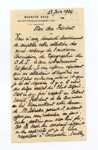L.A.S., datée du 13 Juin 1924, sur son papier à en-tête parisien, adressée à Mon cher Président. Format 10,4 x 18 cm, 30 lignes. L’essentiel de la lettre concerne les procès verbaux de la Commission de Toponymie du C.A.F. qu’il ne possède plus car il les a déposés au siège social du Club Alpin. Franz Schrader, bien que ce ne soit pas son röle, s’est chargé de rechercher ces procès-verbaux. Il va bientöt envoyer à son correspondant une convocation pour une réunion de la Société d’Etudes Topographiques dont il est administrateur-délégué.
