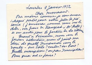 Carte autographe signée, datée de Lourdes, 9 Janvier 1952, écrite sur une carte postale à en-tête du Musée Pyrénéen, adressée à un membre du Conseil d’Administration du Musée Pyrénéen. Format 13,6 x 10,2 cm, 23 lignes. Margalide Le Bondidier envoie à son interlocuteur, un chèque correspondant au jeton de présence. Elle demande des consignes au sujet de l’exécution d’un écusson et annonce que la construction de la Salle du Costume du Musée Pyrénéen est commencée. Elle souhaite que son interlocuteur contacte de toute urgence Raymond Ritter afin qu’il décide du sens de la visite pour cette salle.