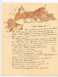 L.A.S., sur beau papier illustré du Musée Pyrénéen du Château-Fort de Lourdes, datée de Lourdes, 15 Octobre 1955, adressée au Bibliophile Bordelais Hubert Dupont. Format 21 x 26,8 cm, 43 lignes ; avec l’enveloppe d’envoi timbrée. Margalide Le Bondidier adresse à Hubert Dupont la liste des livres et plaquettes de Louis Le Bondidier encore disponibles, ainsi que leurs prix. Elle signale qu’il ne lui reste plus qu’un seul exemplaire de Un mois sous la tente. Elle signale aussi qu’il reste deux collections complètes des Carnets de Ramond, et quelques tomes II, III, et IV dépareillés. Toute la partie supérieure de la lettre est occupée par la reproduction en bistre du Château Fort de Lourdes dessiné par Charles Jouas.