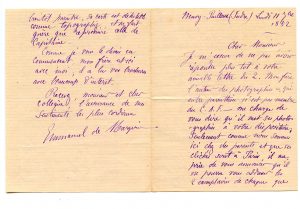 L.A.S., datée de Meury-Pailloux (Indre), lundi 11 septembre 1882, adressée à un pyrénéiste. Quatre pages sur papier rose pliées au format 10,4 x 13 cm, 29 lignes. Importante lettre concernant la topographie pyrénéenne. Je connais Fr. Schrader qui m’a toujours donné très aimablement les conseils que je lui demandais pour le dessin en montagne. Je suis heureux d’apprendre de vous que je trouverai en Mr Prudent un collègue aussi obligeant que compétent en orographie des Pyrénées.... M. L. Carez ... a publié sous le titre de « Recherches géologiques dans le Nord de l’Espagne » le résultat de 3 saisons de travail sur le terrain... Cet ouvrage contient aussi une analyse critique très détaillée de tous les travaux antérieurs jusqu’à Mallada et Vidal... Sa carte est détestable comme topographie et ne fait guère que reproduire celle de Capitaine...