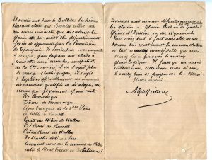 L.A.S. datée du 10 Avril 1925, sur papier à en-tête de la Fédération Internationale des Société Pyrénéistes, Commission de Toponymie et de Topographie, adressée à son collègue l’abbé Ludovic Gaurier. 4 pages pliées au format 21 x 14 cm. Importante lettre au sujet de l’ascension du Vignemale par Chaussenque et de la toponymie du Massif du Vignemale. Meillon a oublié de communiquer à l’abbé Gaurier une importante note de Beraldi au sujet de l’ascension du Vignemale par Chausenque [...] Et en relisant le Bulletin Pyrénéen les diverses dénominations que Beraldi relève, des divers sommets qui encadrent le glacier devraient être définitivement fixées et approuvées par la Commission de toponymie. Je désire vous consulterà ce sujet, pourpréparerune étude.... Suit la liste des pics concernés et aussi des différentes parties du glacier du Vignemale à nommer.... Vous seriez tout à fait aimable de me donner très exactement la nomenclature de tout ce massif que vous avez fixée pour vos travaux glaciologiques ajoute A. Meillon. Sur la 4e page de la lettre, l’abbé Gaurier a écrit à l’encre noire, le thème de la lettre : Vignemale. Nomenclature des cimes et des glaciers.