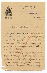 L.A.S., datée du 27 Octobre 1010, sur papier à en-tête du Club Alpin Français, Section du Sud-Ouest, surchargée du timbre humide du Château de La Valouze, La Roche-Chalais (Dordogne) adressée à un membre de la Section du Sud-Ouest du C.A.F. Une page format 13,5 x 21 cm, 20 lignes. Intéressante correspondance sur les problèmes internes du la Section du Sud-Ouest du C.A.F. : échange de Bulletins de la Section avec Louis Le Bondidier. Saint-Saud envoie à son correspondant un paquet de vieux Bulletins de la Section, dont plusieurs peut-étre épuisés,[qu’il a] sauvés du pillage aux Eaux-Bonnes. Saint-Saud ajoute sur un ton aigre-doux : Vous voyez que je ne néglige pas les intéréts de notre section, malgré les petits horions que cela peut m’occasionner. Pléiade : nom donné par BERALDI à un groupe de 8 personnes qui participèrent à la conquête des sommets pyrénéens de 1860 à 1902.
