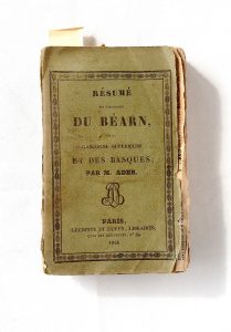 ADER (Jean Joseph) Résumé de l'histoire du Béarn, de la Gascogne supérieure et des basques - Paris, Lecointe et Durey, 1826 - in-12 : 2 f., 328 p., [1] f. [Table des Matières] - Broché, couv. bleue imprimée.