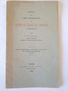 BERNARD (Bertrand) Notice sur les fresques de l'Eglise de Cazaux-de-Larboust (Haute-Garonne) - Tours, Imp. Paul Bousrez, [1882] - In-8° : 56 p., [1] f. bl., 2 pl. h.-t. in fine dont 1 dépl. - Broché, couv. vert-clair impr. en rouge et noir.
