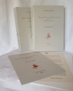 (infime tache à la couverture) Tirage à 318 exemplaires, celui-ci nominatif n° JL 8, un des 25 hors-commerce sur Rivoli blanc imprimé pour l’auteur à l’intention de ses amis, avec envoi de l’auteur. Bien complet de la reproduction de la lettre de Russell et des deux pages d’épreuves corrigées. Joints plusieurs documents : bulletin de souscription, lettre de l’éditeur, 1 feuille du tirage d’essai de l’ouvrage. Le tome 1 est une Biographie d'Henry Russell, le Tome 2 une Bibliographie très complète. Provenance : Ex-libris : J. T. P. sur les faux-titres et les documents joints.
