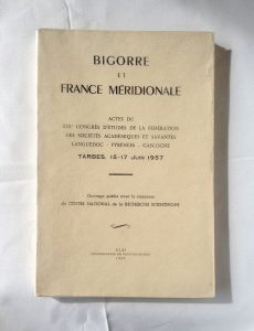 - In-8° : 246 p., [1] f., nbr. fig. in-t., pl. photograv. h.-t. sur papier glacé - Broché, couv. crème impr., non coupé. Actes du XIIIe Congrès d'Etudes de la Fédération des Sociétés Académiques et Savantes Languedoc - Pyrénées - Gascogne. Tarbes, 15-17 Juin 1957. Avec des articles de P. de Gorsse, M. Labrousse, R. Coquerel, P. Tucoo-Chala, X. Ravier, F. Taillefer, M. Daumas, V. Allègre, etc.