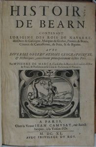 MARCA (Pierre de) Histoire de Béarn, contenant l'origine des Rois de Navarre, des Ducs de Gascogne, Marquis de Gothie, Princes de Béarn, Comtes de Carcassonne, de Foix, et de Bigorre. Avec diverses observations géographiques, et historiques,...