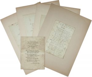Manoscritto a inchiostro seppia (mm 190x120). 1 bifolio, scritte 2 pagine. Parzialmente applicato su cartoncino moderno. SI ALLEGANO: 4 sonetti (3 manoscritti e 1 a stampa) dei seguenti autori: Ippolito Pindemonte, il Canonico Boccaccio, Vincenzo Monti e Antonio Mezzanotte. Dimensioni varie. (5). I DOCUMENTO: Componimento autografo (?) in versi. Non firmato. Giovanni Pindemonte, fratello di Ippolito, arrivò a Milano nel 1806, ma ben presto di allontanò indignato dalla città lombarda per tornare a Verona. Questo è il sonetto di addio, all'epoca divenuto molto celebre: «Fanarotti fotui, genia bricona, / Ve lasso, ve go in e... e vado via, / Ve maledissa el Ciel, GesÙ e Maria / Gente porca, p... e busarona. / Finalmente a veder torno Verona, / Verona alma Città e Patria mia, / Ove genio, bontade e cortesia / Facilmente ritrova ogni persona. / Ve incenerissa il Ciel orrido e tristo, / Asilo di 'sozzure e popol rio / D'infamità e lupanario misto. / Aborti di natura in odio a Dio, / Feccia piÙ rea del traditor di Cristo, / Ladroni infami e scelerati addio». Seguono altri due componimenti in versi: uno senza titolo, l'altro Napoleone a S. Elena.
