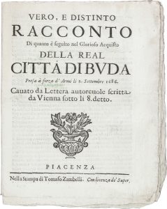Vero e distinto racconto di quanto è seguito nel Glorioso Acquisto della Real Città di Buda presa à forze d'Armi li 2 settembre 1686... Piacenza: Tomaso Zambelli, [1686].
