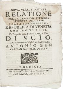 Nova, Vera, e Distinta Relazione della gloriosa Vittoria ottenuta dall'Armi della Serenissima Repubblica di Venezia contro Turchi Coll'acquisto della Famosa Città, & Isola di Scio sotto il comando [...] Antonio Zen... Brescia: Policreto Turlino, 1694.