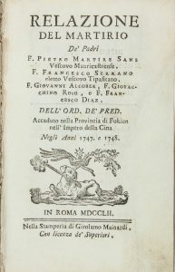 Relazione del martirio de' Padri F. Pietro Martire Sans [...] F. Francesco Serrano [...] F. Giovanni Alcober [...] accaduto nella provincia di Fokien nell'impero della Cina negli anni 1747 e 1748. In Roma: Nella stamperia di Girolamo Mainardi, 1752.