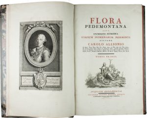 3 volumi in-folio (mm 408x256). Pagine [10], XIX, [1], 344; [4], 366, XIV, [2]; [4], XIV, 2 bianche e 92 carte di tavole numerate incise in rame. Ritratto di Vittorio Amedeo III inciso da Stagnon in antiporta, ciascun volume con proprio occhietto e frontespizio in inchiostro rosso e nero con vignetta calcografica. Ottimo esemplare, con alcune carte leggermente brunite. Legatura coeva in piena pelle verde con titoli dorati su etichetta e ferri floreali ai comparti del dorso a 7 nervi. Spellature ai piatti e punte stanche. Rara prima edizione dell'opera piÙ importante di Allioni, considerata uno dei primi erbari regionali; frutto del lavoro di 25 anni di ricerca, riorganizzazione delle specie e sistematica ridenominazione in senso moderno della flora spontanea dell'arco alpino occidentale, questo fondamentale trattato enumera 2831 specie di piante del territorio piemontese, 237 delle quali catalogate per la prima volta proprio dall'Autore; inoltre 92 splendide tavole incise in rame da di Pietro Peyroleri illustrano 221 delle specie descritte. Cfr. Nissen BBI, 18.