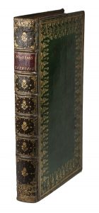 In-folio (mm 434x268). Pagine [8], 303, 1 bianca; [20]; [4], 151, 1 bianca; [8], 283, 1 bianca; 18, [14]; [4], 26, 2 bianche; 3, 1 bianca. Testo greco con testo latino a fronte, con lo specchio di scrittura inquadrato da filetti rossi. Esemplare con lievi bruniture, occasionalmente piÙ accentuate, e con qualche gora d'acqua marginale. Splendida legatura settecentesca in piena pelle, verde ai piatti e marrone al dorso, con una ricca cornice a motivi floreali impressa in oro ai piatti e titoli dorati su tassello al dorso a 6 nervi, con i comparti decorati; dentelles di motivi geometrici e floreali alle unghiature e tagli dorati. -