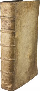 In-folio (mm 366x240). Carte [5], [377] complessive con numerazione a colonne. Gore d'acqua lavabili a molte carte ma bell'esemplare. Bella legatura coeva in pelle di capra allumata, con molteplici cornici concentriche di fregi floreali alternate a fasci di filetto impresse a secco, titoli su tassello cartaceo al dorso a 5 nervi; fermagli conservati. Minime mende. Molto raro.