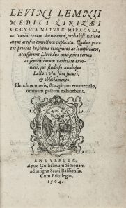 Lemnius Levinus, Occulta Naturae Miracula, ac varia rerum documenta, probabili ratione atque artifici coniectura explicata... Antverpiae: Apud Guilielmum Simonem ad insigne Scuti Basiliensis, 1564.