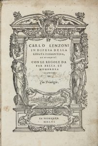 Lenzoni Carlo, In difesa della lingua fiorentina, et di Dante. Con le regole da far bella et numerosa la prosa. In Fiorenza, 1556 (Al colophon:) In Fiorenza: appresso Lorenzo Torrentino, 1557.