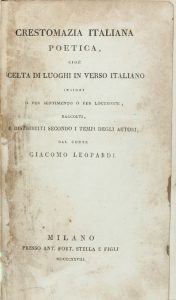 Leopardi Giacomo, Crestomazia italiana poetica, cioè scelta di luoghi in verso italiano insigni o per sentimento o per locuzione... Milano: presso Ant. Fort. Stella e figli, 1828.