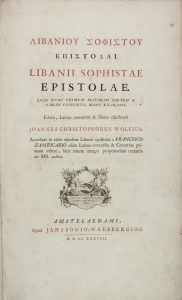 Libanius, Epistolae. Quas nunc primum maximam partem e variis codicibus [...] edidit, latine convertit & notis illustravit Joannes Christophorus Wolfius [...]. Accedunt in calce ejusdem Libanii epistolae a Francisco Zambicario... Amstelaedami: apud...