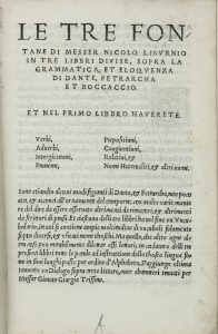Liburnio Niccolo, Le tre fontane [...] in tre libbri divise, sopra la grammatica, et eloquenza di Dante, Petrarcha et Boccaccio. (Al colophon:) In Vinegia: per Marchio Sessa, 1534.