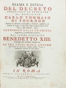 Lucini Luigi Maria, Esame e difesa del decreto pubblicato in pudisceri da Monsignor carlo Tommaso di Tournon [...] approvato, e confermato con breve dal sommo pontefice Benedetto XIII... In Roma: nella Stamperia vaticana, 1728 (Al colophon:) Roma:...