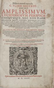 Plinius Secundus Gaius, Historia mundi naturalis [...] In libros XXXVII distributa, vivisque imaginibus illustrata... Typis excudebatur Francoforti ad Moenum, à partu Deipar & virginis, 1582 (Al colophon:) Francoforti ad Moenum: ex officina Martini...
