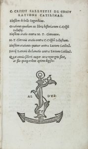 Sallustius Crispus Gaius, De coniuratione Catilinae. Eiusdem de bello Ingurthino... (al colophon:) Venetiis: in aedibus Aldi et Andreae soceri, 1521.