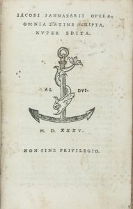 Sannazaro Jacopo, Opera omnia latine scripta, nuper edita. 1535 (Al colophon:) Venetiis: in aedibus haeredum Aldi Manutii, et Andrea Asulani soceri, 1535.