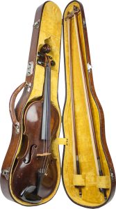 Strumento conservato in custodia di noce insieme a due archi non timbrati.