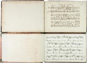 Manoscritto musicale. Spartito per canto e chitarra e per chitarra sola. 97 pagine. Manoscritto a inchiostro seppia su carta pentagrammata a mano decorata. Brani in francese, inglese e italiano. Legatura in mezza pelle con angoli. Dimensioni: 135x180. SI AGGIUNGE: Toccate per organo / 1859. Manoscritto musicale. Spartito per organo. 125 pagine ca. Inchiostro nero e azzurro. Il volumetto contiene anche molti brani tratti da melodrammi. Con timbro a inchiostro RGP. (2). -