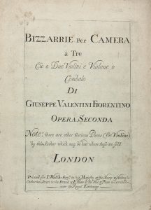 Valentini Giuseppe, Bizzarrie per Camera / à Tre / Cio e Due Violini e Violone o / Cembalo / [...] / Opera Seconda /... London: Walsh, [1721].
