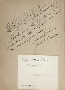 Manoscritto a penna nera, blu e matita. 118 carte, con moltissime fotografie originali autografate o con dedica e con alcune lettere e cartoline incollate con firma autografa. Allegati anche vari ritagli di giornale che recensiscono l 'arrivo delle celebrità negli alberghi di Firenze, Venezia e del Lago Maggiore. Legatura in pelle con segni del tempo (dorso scollato e fermagli staccati, ma conservati). Dimensioni: mm 245x180. L 'album è appartenuto a Boris Skerl, direttore degli Hotel Excelsior di Firenze poi dell 'Hotel Danieli di Venezia e dell 'Hotel Des Iles Borromees. Raccoglie la testimonianza delle moltissime personalità internazionali che frequentarono i tre hotel: re, principi, uomini politici, generali, imprenditori, scrittori, artisti, attori e musicisti. L 'album raccoglie circa centosettanta firme, molte con dedica o con disegno, alcuni incipit musicali, molte fotografie originali con firma e dedica, alcune lettere firmate e cartoline. Il volume si apre con una cartolina autografata da Giacomo Puccini datata “17 settembre 1908” e termina con una fotografia originale che ritrae Hitler che stringe la mano a Mussolini a Firenze, insieme all 'opuscolo che descrive l 'incontro tra i due a Firenze il 28 ottobre 1940. Tra le teste coronate Vittorio Emanuele di Savoia e la Regina Elena, l 'attuale imperatore del Giappone Akihito (con fotografia), Edoardo di Windsor e Wallis (firme e foto), Pahlavi (con fotografia), l 'imperatrice dell 'Indocina Nam Phuo 'ng, Adalberto di Savoia Genova, Filippo d'Assia, Christophe Prince de Grèce e di Danimarca. Tra i musicisti: Franz Lehar (ritratto fotografico autografato), Arthur Rubinstein (con fotografia), Richard Strauss (ritratto fotografico autografato e incipit musicale), Arturo Toscanini (ritratto fotografico autografato), Titta Ruffo (cartolina), Tullio Serafin (ritratto fotografico autografato), Mariano Stabile, Tito Schipa, Yehudi Menuhin, Gian Carlo Menotti, Stokovski (dedica e ritratto fotografico autografato), Sergiu Celibidache, Riccardo Malipiero, Victor De Sabata, Strawinsky (incipit musicale) e Strawinsky con De Chirico (fotografia con firme), Mitropulos Dimitri (dedica), Marinuzzi (ritratto fotografico autografato), Arturo Benedetti Michelangeli (ritratto fotografico autografato, altro ritratto delle mani del pianista autografato e firma e cartolina), Alfred Cortot (ritratto fotografico autografato), dedica di Beniamino Gigli, Igor Markewitz, Segovia. Anche incipit musicali di Franco Alfano, Adriano Lualdi, Giordano, Montemezzi, Nino Cattozzi, Malipiero, Mascagni, Herbert von Karajan, Bachhaus, Pizzetti. Tra gli attori: Tyron Power e Linda Christian, Warner Oland, Vittorio De Sica (anche fotografia), Camillo Pilotto, Gérard Philipe, Totò, María Montez. E ancora: il Generale Clark (lettera firmata e ritratto fotografico autografato), Stefan Zweig (biglietto) Guglielmo Marconi, Maria Cristina Marconi (ritratto fotografico autografato), Achille d'Angelo (il Mago di Napoli), Elsa Maxwell insieme a Maria Callas, Walt Disney, Giuseppe Ungaretti, Alberto Moravia, Carlo Carrà, Riccardo Bacchelli, Michael Angelo Musmanno (lunga lettera), Franz von Papen, De Chirico (anche 2 fotografie, una a Venezia mentre dipinge), Zadkine Ossip, William Saroyan, Pierre La Mure (cartolina e fotografia), Israel Gershowitz (noto come Ira Gershwin), Pietro Annigoni, Harold Clayton Lloyd (dedica), ras Sejum Mangascià, Rodolfo Graziani (ritratto fotografico autografato), Salvador Dalì, Mihai, Antonio Berti (disegni), Sir Bernard Law Montgomery, 1° visconte Montgomery di Alamein, Le Corbusier, Archibald Joseph Cronin e Sinclair Lewis.