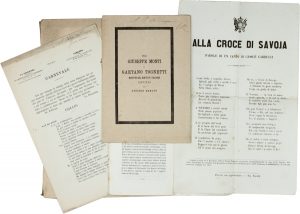 In-12° (150x92 mm). Pagine 22. Brossura originale con una macchia. In fine è allegato il Sonetto ripiegato con indicazione: «Cantato la sera del 4 dicembre 1859 al Teatro Pagliano [...] promossa da Garibaldi [...]». Con dedica autografa firmata «A Isidoro Del Lungo / ricordo d 'amicizia / G. Carducci». SI AGGIUNGE: Id., Per Giuseppe Monti e Gaetano Tognetti martiri del diritto italiano [...]. Pistoia: Niccolai & Quarteroni, 1868. In-8° (180x125 mm). Pagine [8]. Brossura originale. Con dedica autografa firmata «A I. Del Lungo / G. C.». SI AGGIUNGE: Id., Carnevale / [...] Idillio. Estratto da La Gioventù. Firenze: Cellini, s.a. In-4° (230x145 mm). Pagine [4]. Con correzioni autografe e dedica autografa firmata «A Isidoro Del Lungo / Giosuè Carducci». SI AGGIUNGE: Id., Per le nozze di Luisa Zanichelli con Francesco Mazzoni. Bologna: Zanichelli, 21 agosto 1904. XXX esemplari numerati. Il nostro n. 2. Provenienza «Studio Sen. Isidoro Del Lungo - Firenze». (4). -