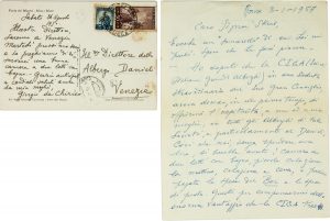 Manoscritto a inchiostro blu. 1 bifolio, scritte 3 pagine. Dimensioni: 205x157 mm. SI AGGIUNGE: Id., Cartolina autografa firmata inviata al direttore dell 'Hotel Danieli di Venezia. Datata 26 agosto 1950. (2). I DOCUMENTO: Curiosa lettera nella quale l 'artista, dopo un lungo preambolo, chiede di poter soggiornare gratuitamente, insieme alla moglie, all 'Hotel Danieli di Venezia.