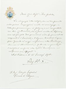 Pius [papa X], Lettera autografa firmata inviata al Vescovo di Foligno. Datata 15 gennaio 1911.