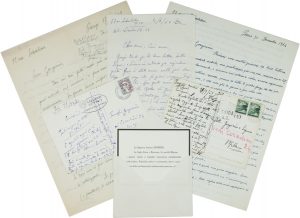 Manoscritto a inchiostro blu. Scritte 4 pagine in totale. Dimensioni: 270x208 mm. SI AGGIUNGONO: Severini Jeanne, 1 lettera e 2 cartoline autografe firmate e 1 biglietto di ringraziamento inviato dopo la morte di Severini. Datati anni '60. (6). Severini chiede di un articolo e anche di poter riavere 4 clichés della riproduzione di un mosaico. Molte righe sono dedicate al suo stato di salute, alle notizie sulla sua famiglia e ai suoi molti impegni lavorativi.