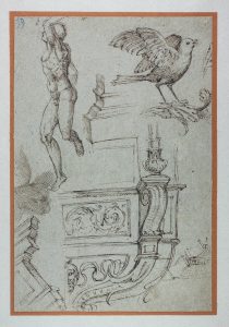 Anonimo lombardo-veneto XVI-XVII secolo, Studi di cornici, figura e uccellino (recto e verso). XVI secolo.