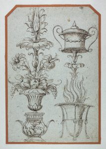 Anonimo lombardo-veneto XVI-XVII secolo, Studi di cornici, candelabre, braciere e un vaso (recto e verso). XVI secolo.