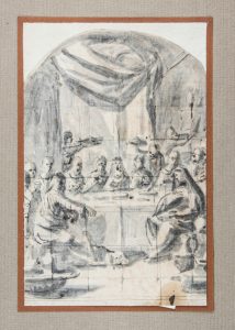 Penna e inchiostro nero e grigio acquerellato, matita nera (anche per la quadrettatura); carta bianca a vergelle. Foglio originale: mm ca. 214x140. Disegno molto interessante e finito, eseguito con una tecnica bozzettistica di gusto nordico, forse preparatorio ad una pala d 'altare. L 'esecuzione potrebbe collocarsi in un ambito abbastanza vicino a quello di Girolamo Romanino. Il foglio originale è ritagliato in alto in forma centinata e interamente incollato ad una carta pesante a vergelle (sec. XVIII); forse ritagliato dalla pagina di un antico album. Presenta alcune macchie d 'inchiostro lievemente oleoso di cui una vistosa, in basso lungo il margine inferiore. I tocchi in penna e inchiostro nero più scuro sono risalgono forse a epoca successiva.