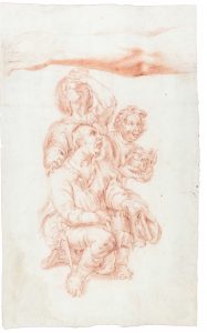 Matita rossa, carta grossa bianca a vergelle. Foglio: mm 446x275. SI AGGIUNGE: Anonimo italiano sec. XVIII (copia da Lanfranco?), Figura maschile tra le nuvole. Secolo XVIII. Matita nera (forse anche carboncino), su carta bianca a vergelle filigranata (filigrana tagliata e visibile in parte a sinistra). Foglio: mm 272x189. (2). I opera: Il foglio presenta uno studio di braccio sinistro, in alto a sinistra, e tracce di un restauro integrativo della carta in basso agli angoli, visibile soprattutto al verso. Strappi e ondulazioni ai lati. Lieve ingiallimento diffuso. II opera: Una gora di umidità interessa tutta la parte destra.