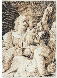 Penna e inchiostro carta bianca a vergelle, con filigrana (illeggibile). Foglio: mm 202x145ca. Supporto: mm207x148ca. Il foglio originale è controfondato, ossia incollato per intero dal verso a una carta pesante (sec. XVIII, fine), forse il frammento di una pagina di album. Si tratta di un “tocco in penna”, ossia di un disegno che finge il ductus incisorio. In buone condizioni di conservazione, nonostante una leggera sporcizia diffusa, soprattutto al verso, in cui son anche evidenti agli angoli tracce di precedenti incollaggi.
