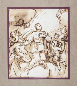 Penna e inchiostro su lievi tracce di matita rossa, inchiostro acquerellato; carta bianca a vergelle (sec. XVII). Foglio: mm 192x165. Il bellissimo disegno proviene dalla Collezione Chiantorre, di cui reca il cartellino presente al verso del supporto cartaceo, con una attribuzione a “Scuola Olandese”. Il foglio nonostante la presenza di una mancanza lungo il bordo laterale sinistro, integrata anticamente con una toppa molto visibile al verso, è in ottime condizioni e la parte disegnata di grande qualità. è incollato lungo il margine superiore al verso a un cartoncino rosso (sec. XX) a sua volta fissato, nello stesso modo, a un supporto cartaceo moderno.