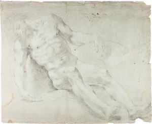 Matita nera, gesso, su carta cerulea vergellata e filigranata (cerchio con elemento non leggibile) leggermente preparata. Foglio: mm 406x497. Al verso, manoscritta a penna e inchiostro un 'iscrizione del XVIII secolo: “ N. 43/Aless. Maggioni comprò/in Roma ai 19 Xbre/del 1794”. Foglio non in perfette condizioni ma di grande qualità e notevoli dimensioni, con una chiara impronta carraccesca nella trattazione del chiaroscuro che trova delle affinità anche con gli studi a matita su carta cerulea di Cristoforo Roncalli (Pomarance 1553-Romaagli Uffizi, eseguiti in preparazione della pala della Cappella Clementina in San Pietro (1599-1606). Oltre a due pieghe verticali, la carta presenta numerosi piccoli strappi e mancanze lungo i bordi, tracce di umidità, alcuni fori e piccole macchie; ma la parte disegnata è pienamente leggibile.